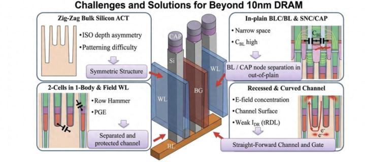 关联词,在需求爆炸式增长的背后,是传统二维平面动态立时存取存储器(DRAM)靠近的要害物理和工程限制。尽管DRAM通过不断缩小尺寸提高了集成密度,但跟着尺寸缩小到10纳米以下的1c和1d节点,存储电荷的电容器和收敛它们的晶体管的物理尺寸缩小已达到极限。迥殊是,当物理尺寸缩小到20纳米以下时,电子隧穿、栅极走电和器件间插手等问题会严重指责大范畴分娩的良率和功率收尾。